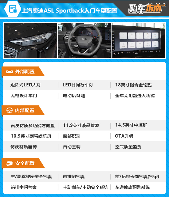 上汽奥迪A5L Sportback入门版车型为豪华型,售价27.99万元。不仅价格极具诚意,而且车如其名,配置表现丝毫不显寒酸。虽然入门版车型的性价比很高,但是对于购买这个级别车型的消费者来说,普遍还是会追求更好的驾乘体验,价格往往不会成为决定因素,因此入门版车型并不值得推荐。