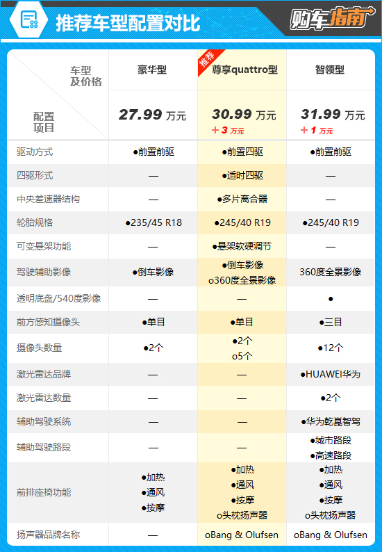 智领型售价31.99万元,相较推荐车型,可以理解为是以放弃quattro四驱以及增加1万元预算的代价,得到了华为乾崑智驾系统。不得不说,上汽奥迪的“刀法”确实非常精准,因为如果想要两者兼得,那么“最低消费”至少也得是售价33.99万元的智领quattro型。