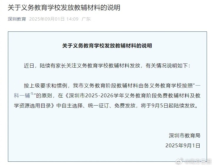 9月1日,深圳教育发布《关于义务教育学校发放教辅材料的说明》:近日,陆续有家长关注义务教育学校教辅材料发放,有关情况说明如下:按上级要求和惯例,我市义务教育阶段教辅材料由各义务教育学校按照“一科一辅”的原则,在《深圳市2025-2026学年义务教育阶段免费教辅材料及教学资源选用目录》中自主选择、统一征订、免费发放,将于9月5日起陆续发放。