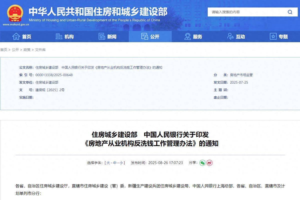 8月26日,住房城乡建设部、中国人民银行印发《房地产从业机构反洗钱工作管理办法》(以下简称《办法》),自2025年9月1日起施行。业内人士认为,该《办法》为房地产行业反洗钱工作提供了明确的指导和规范。