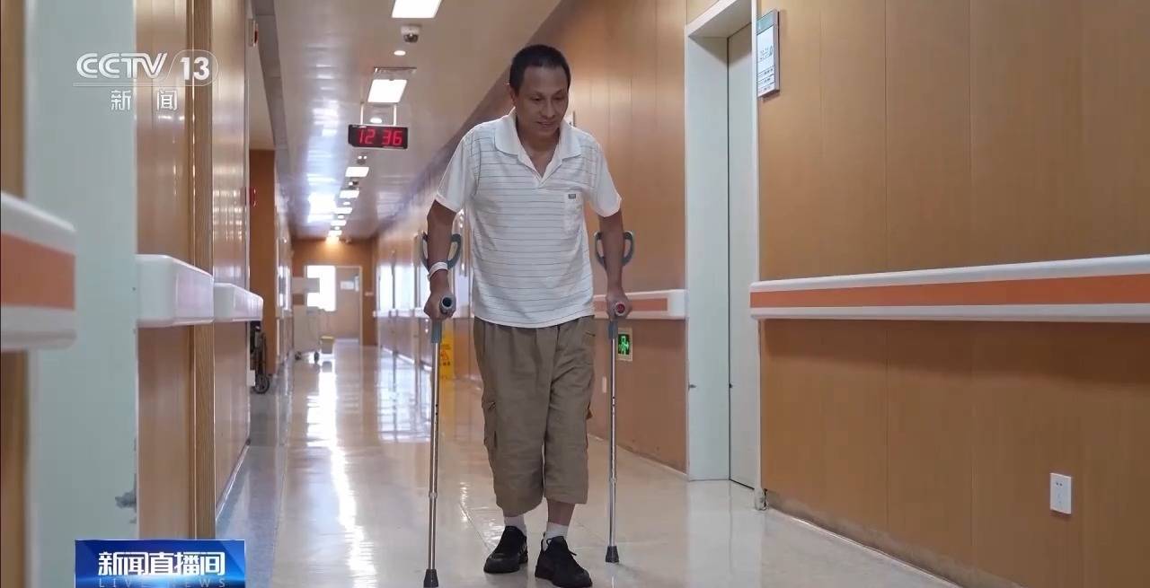 r吉林大学第二院康复医学中心副主任医师 张海娜:患者进行脊髓接口手术以后,我们对他进行了系统的康复治疗,通过电刺激、针灸、生物反馈、手法治疗等等,患者的功能得到了很大的改善。现在他已经可以在外骨骼机器人的帮助下,进行自主站立和行走。